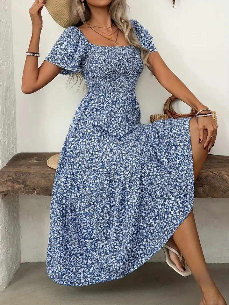 Kadın Kısa Kollu Gipe Detaylı Desenli Midi Süprem Elbise