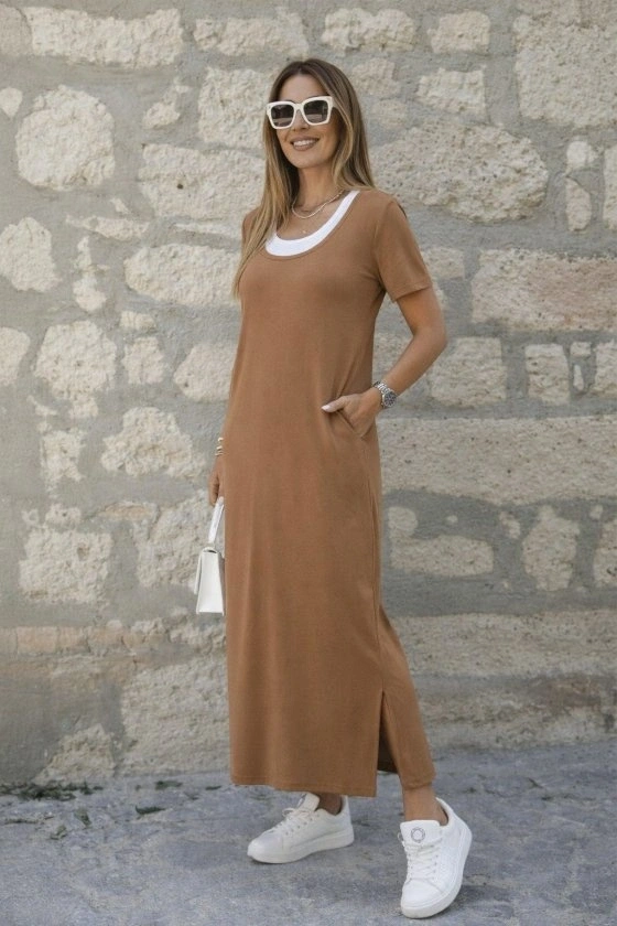 Kadın Kısa Kollu Içi Atlet Görünümlü Yandan Yırtmaçlı Uzun Viskon Elbise