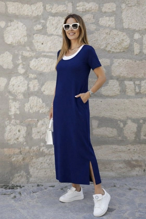 Kadın Kısa Kollu Içi Atlet Görünümlü Yandan Yırtmaçlı Uzun Viskon Elbise