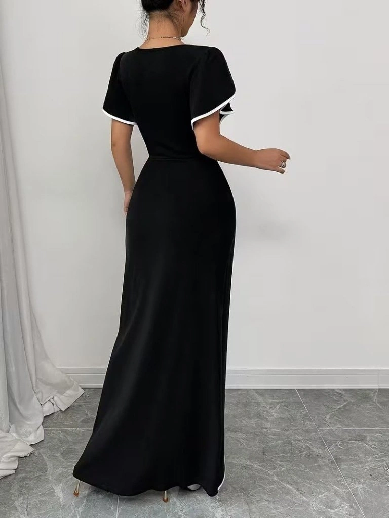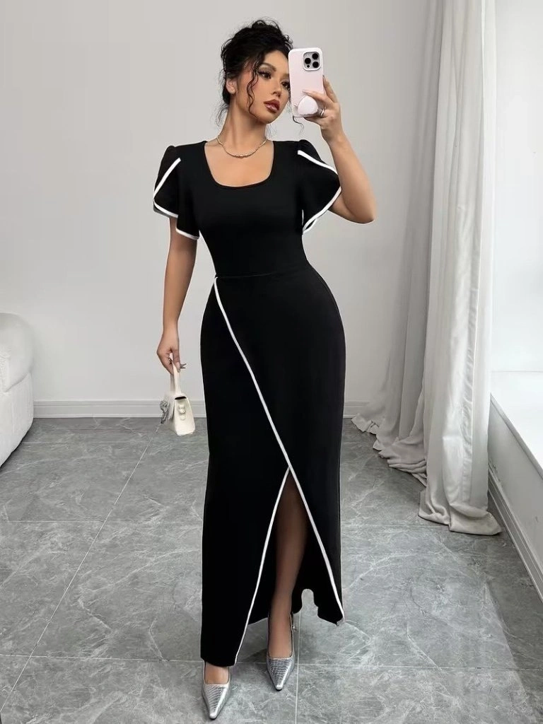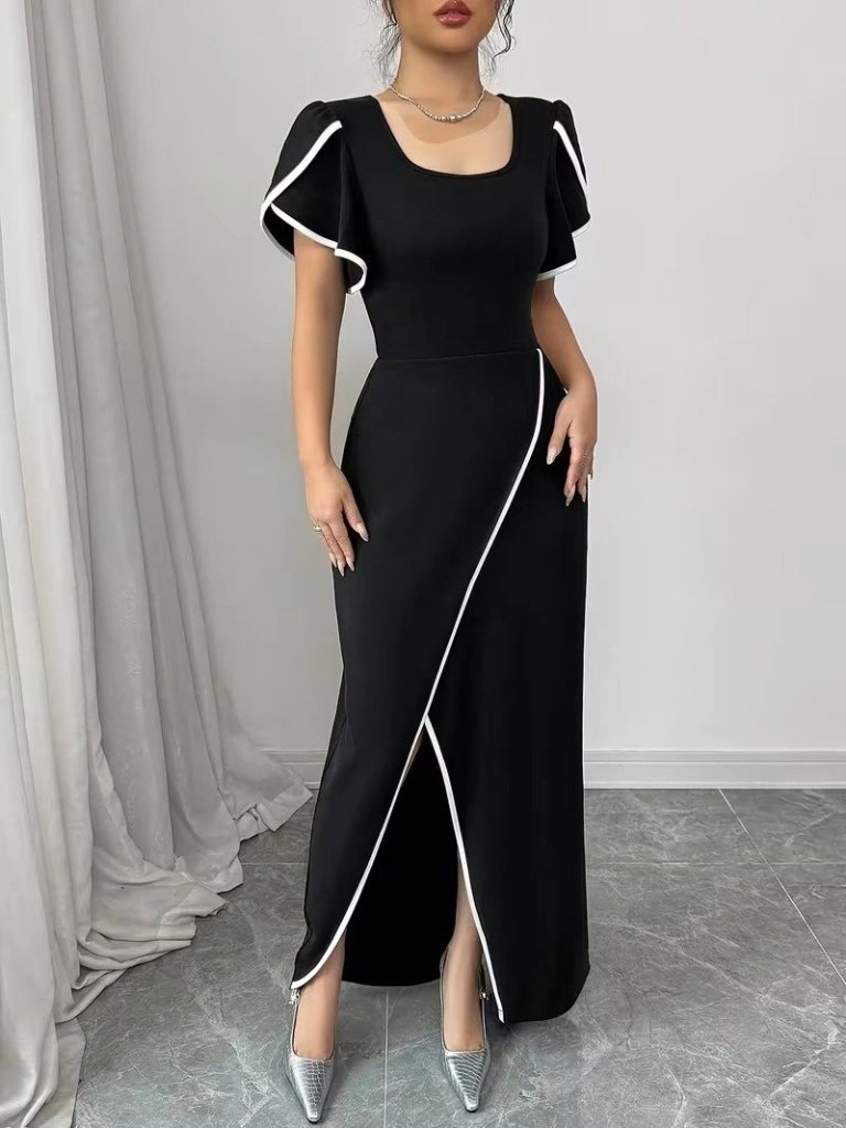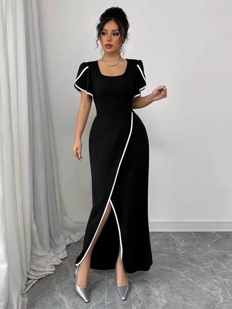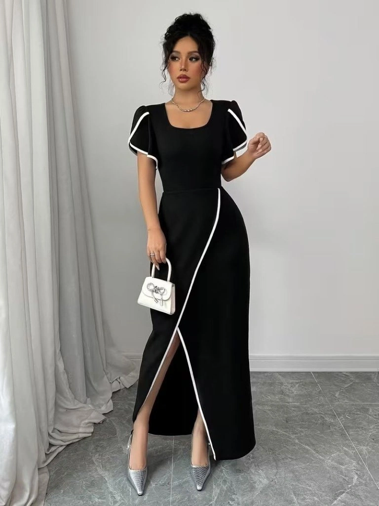 Kadın Kısa Kollu Kare Yakalı önden çapraz Kesim Detaylı Krep Elbise