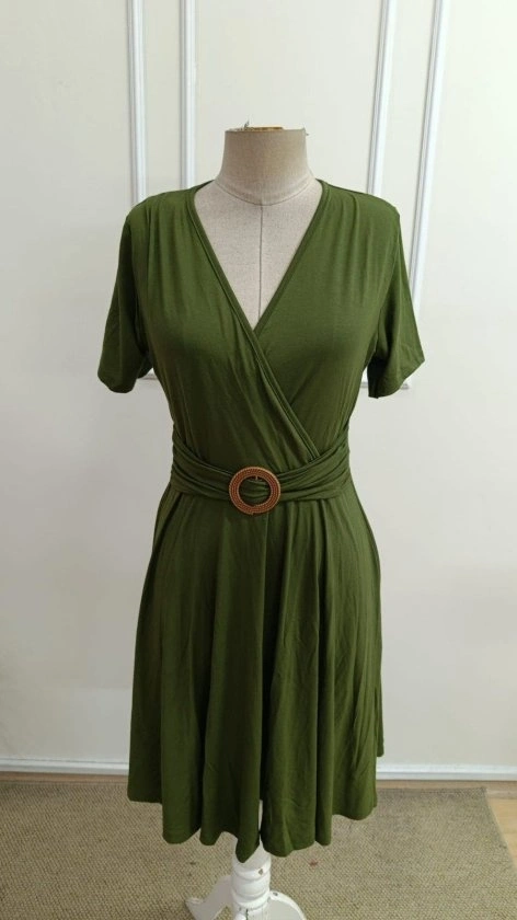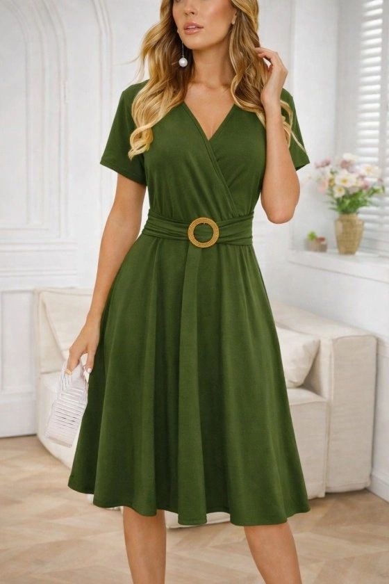 Kadın Kısa Kollu Kruvaze Yakalı önden Toka Detaylı Kısa Viskon Elbise