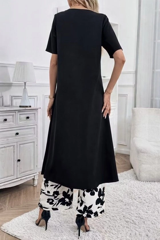 Kadın Kısa Kollu önden çapraz Detaylı Viskon Uzun Bluz Ve Desenli Iki Iplik Pantolon Ikili Takım