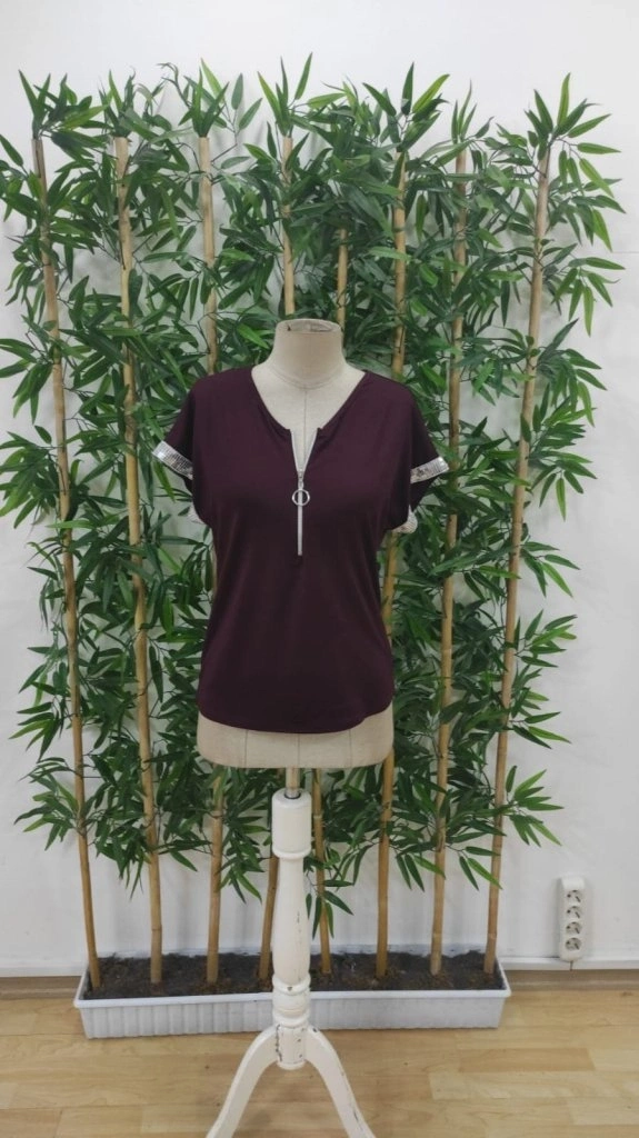 Kadın Kısa Kollu önden Fermuarlı Kol Ucu ışıltılı Viskon Bluz