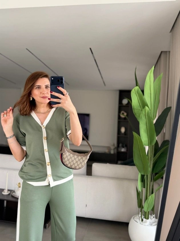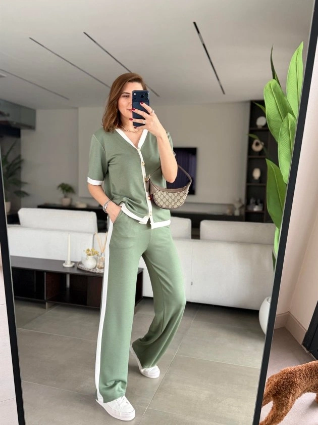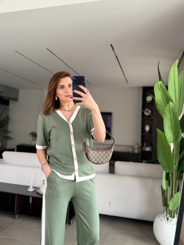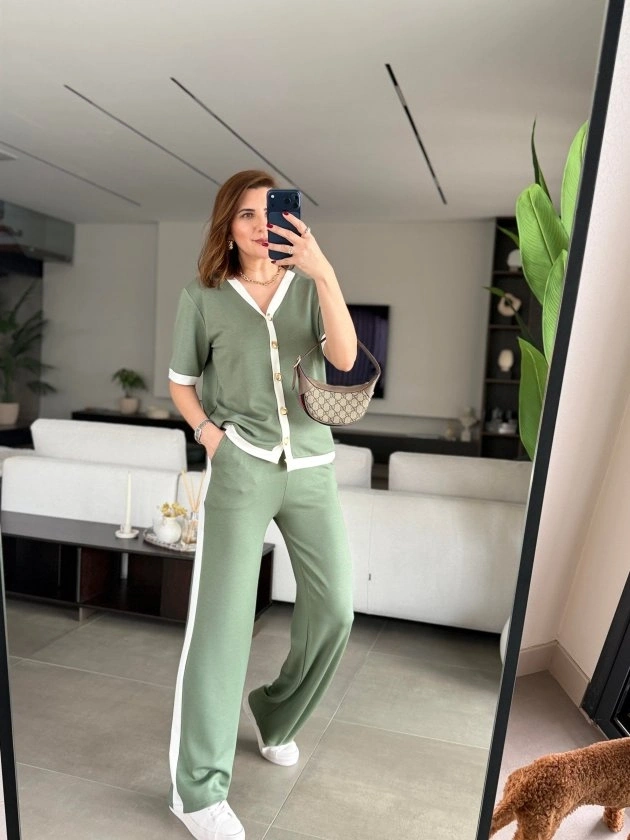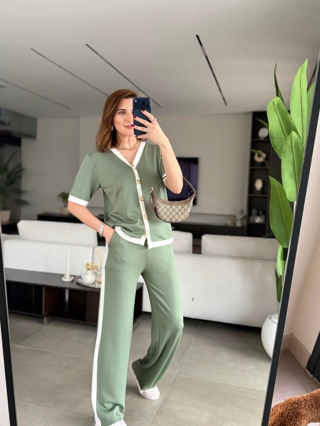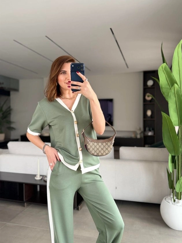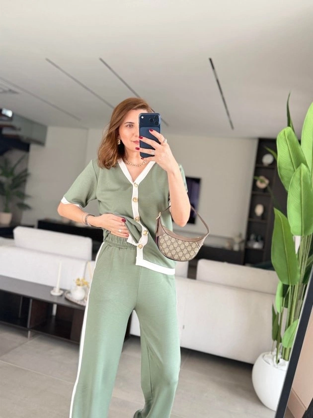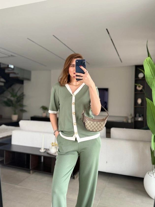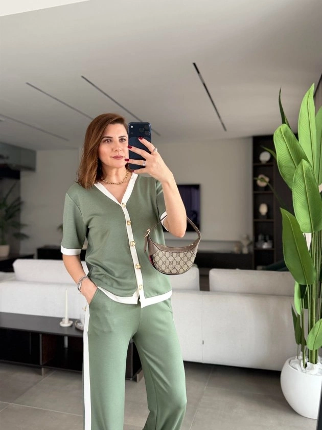 Kadın Kısa Kollu Ribana Ve Gold Düğme Detay Hırka Yanı şeritli Pantolon Ikili Takım