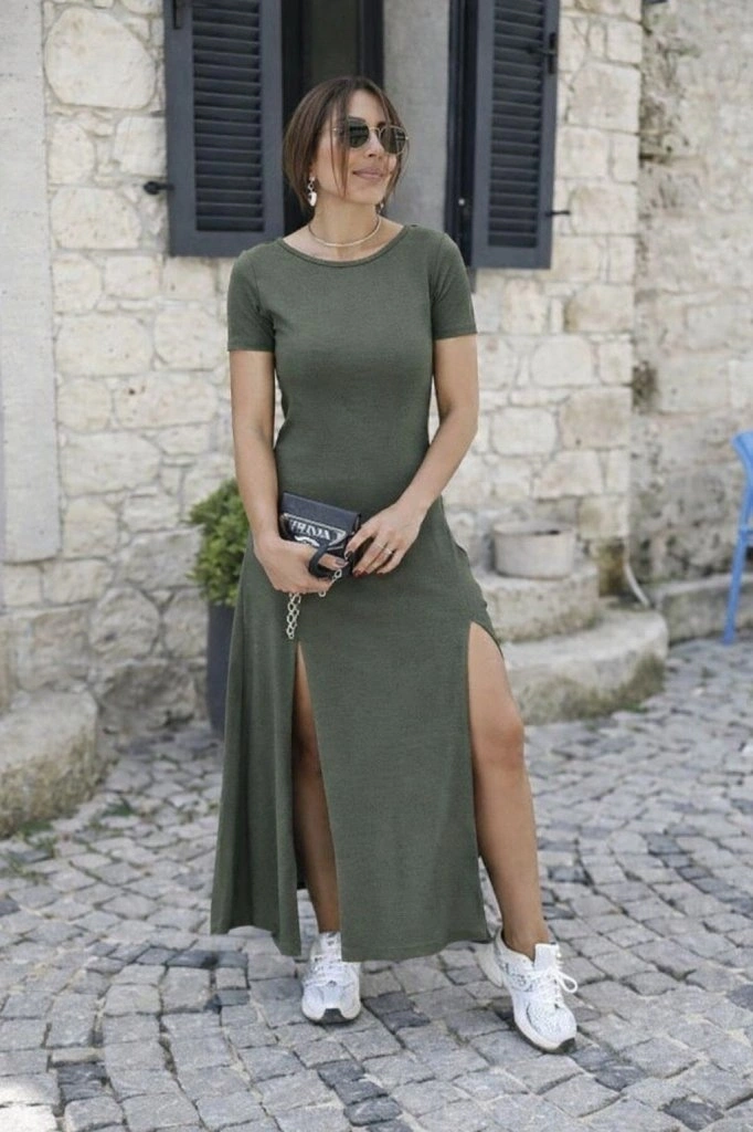 Kadın Kısa Kollu Sırt Dekolteli Yırtmaç Detaylı Viskon Elbise