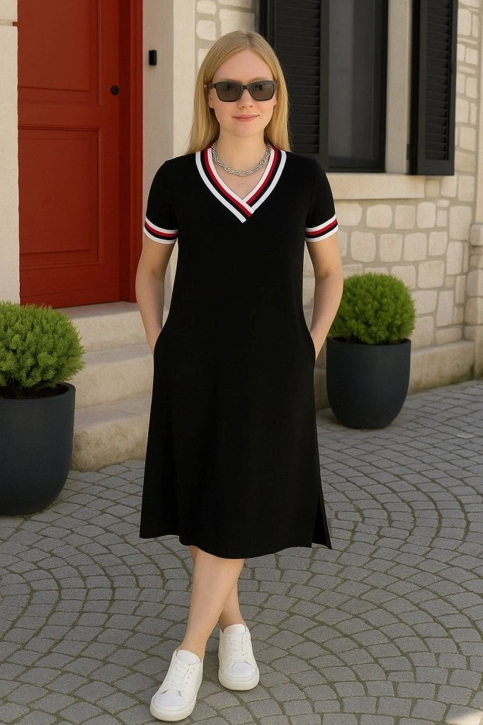 Kadın Kısa Kollu V Yaka Ribana Detay Midiboy Viskon Elbise
