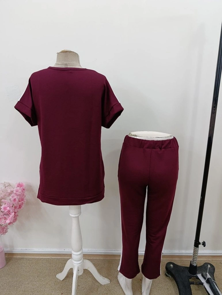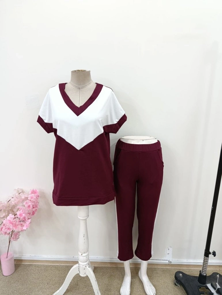Kadın Kısa Kollu V Yakalı çift Renkli Viskon Iki Iplik Ikili Bluz Ve Pantolon Takım