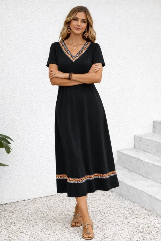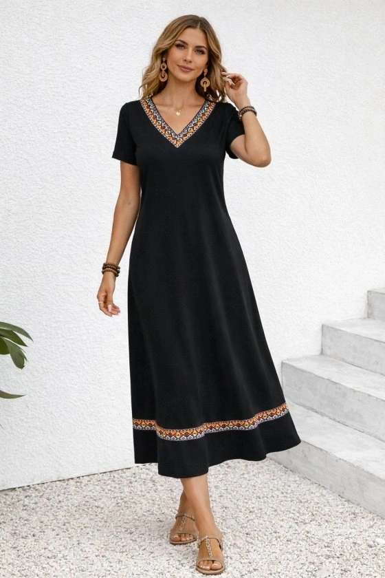 Kadın Kısa Kollu V Yakalı Etnik şerit Detaylı Uzun Viskon