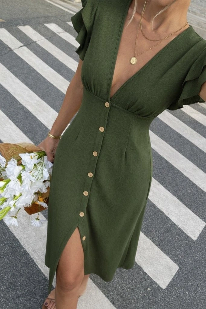 Kadın Kısa Kollu V Yakalı önden Düğmeli Bürümcük Midi Elbise