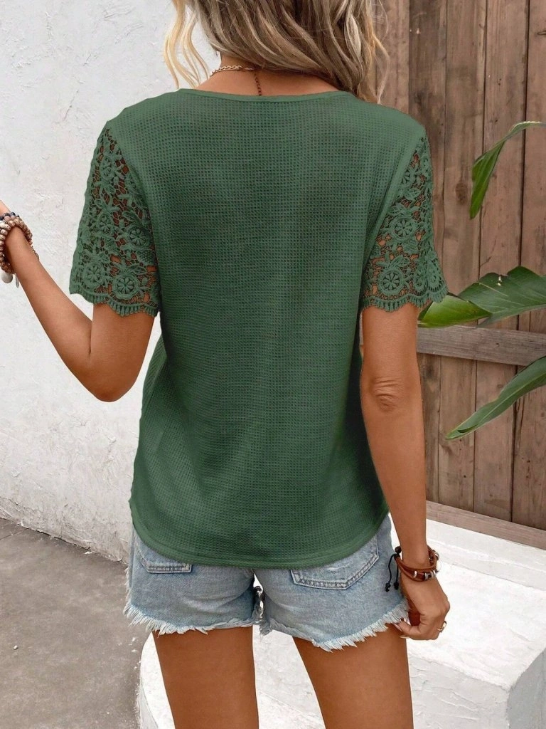 Kadın Kısa Kollu V Yakalı önden Düğmeli Dantel Detaylı Waffle Bluz