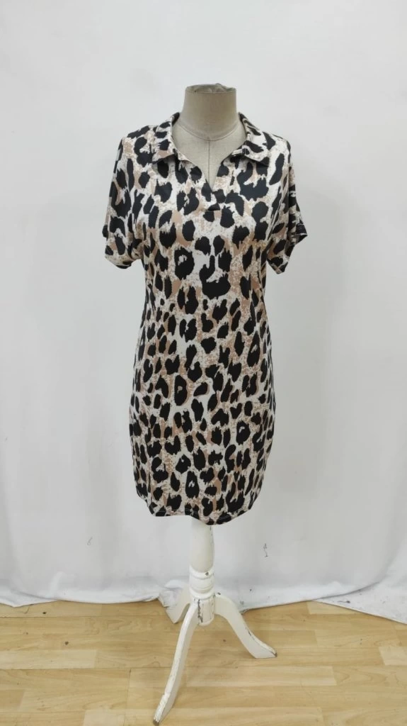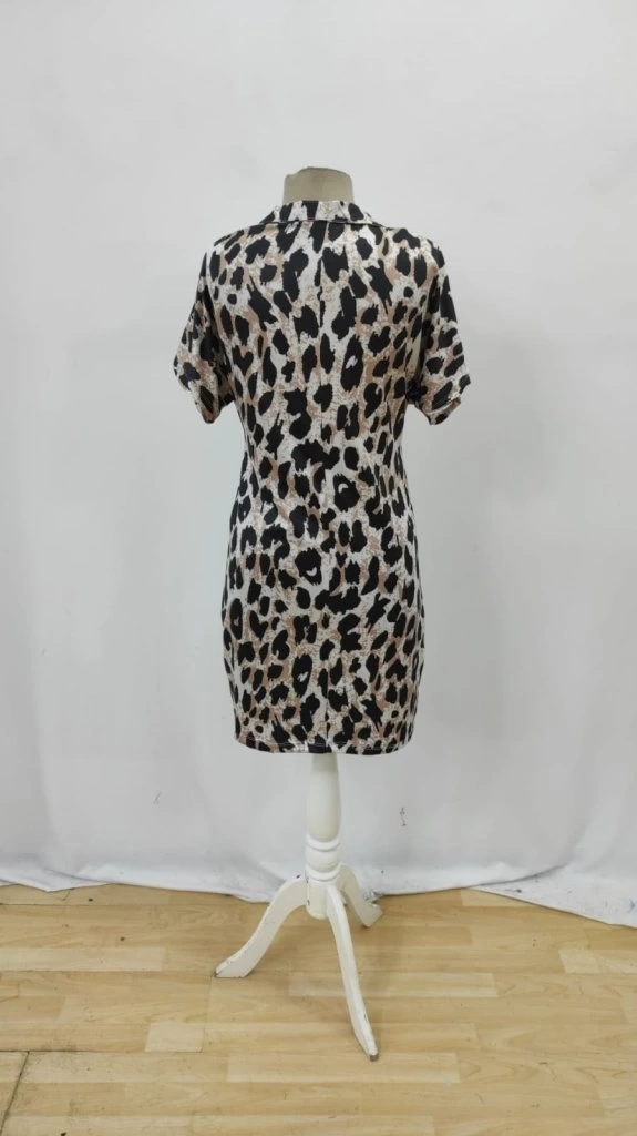 Kadın Kısa Kollu Yakalı Leopar Desenli Süprem Elbise