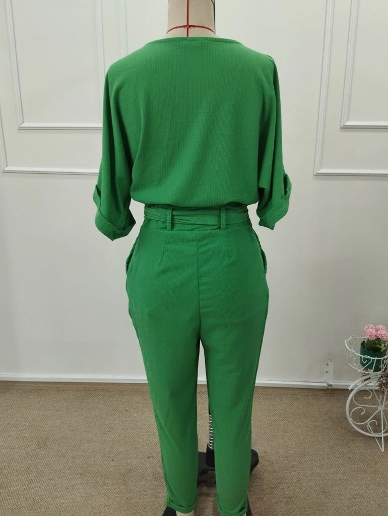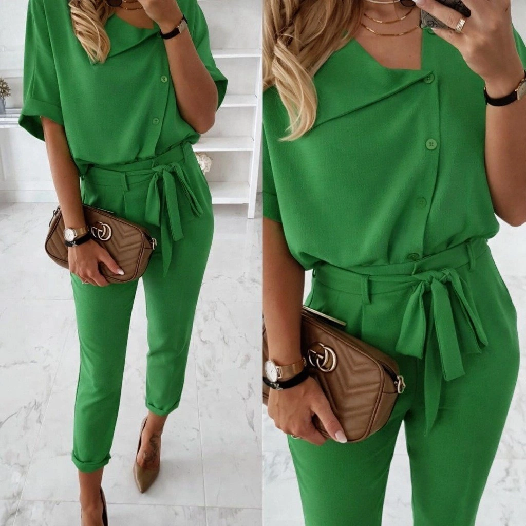 Kadın Kısa Kollu Yakalı önden Düğmeli Bürümcük Bluz Ve Pantolon Ikili Takım