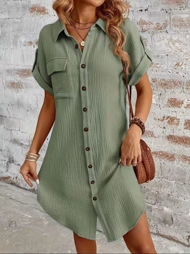 Kadın Kısa Kollu Yakalı önden Düğmeli Bürümcük Kısa Elbise