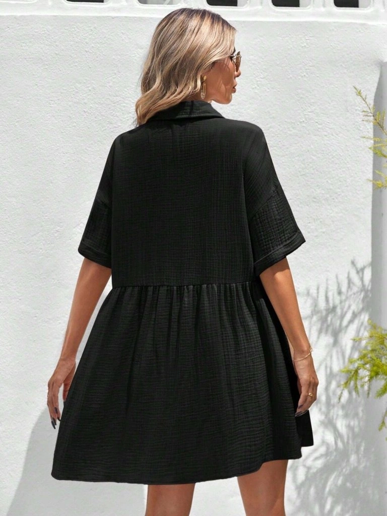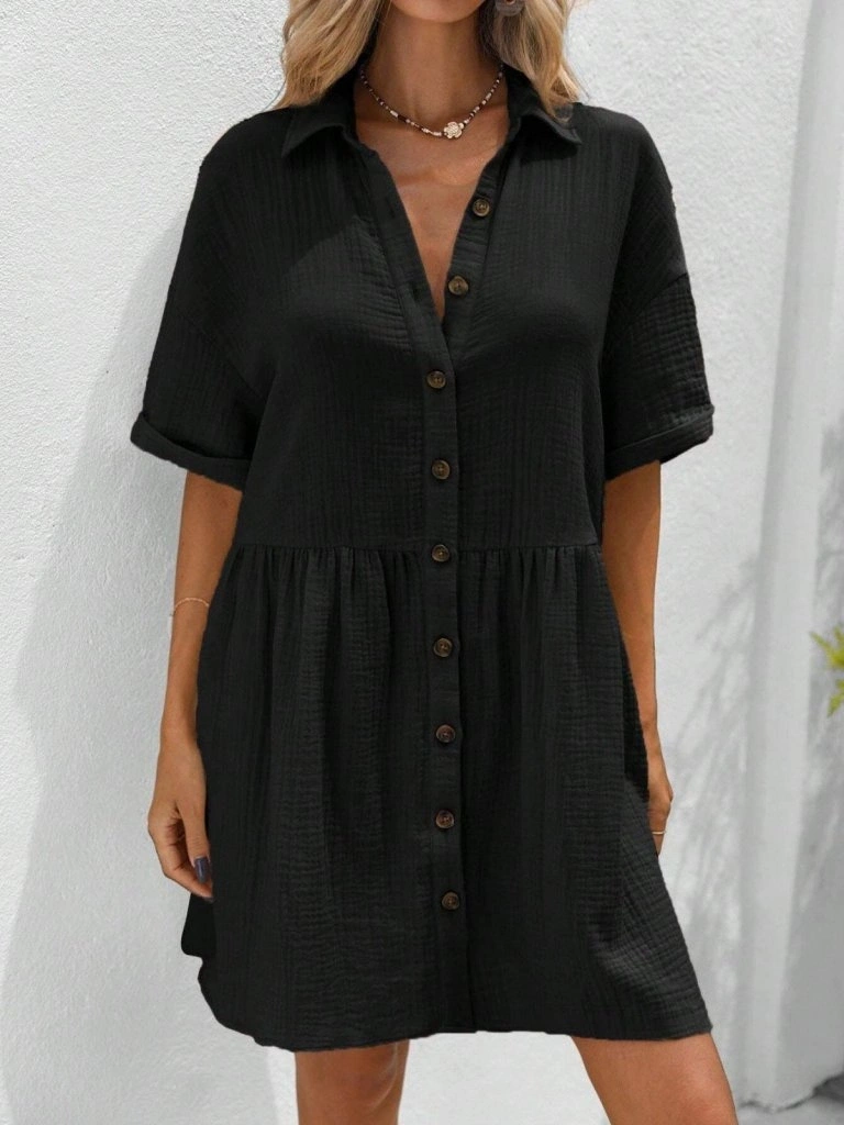 Kadın Kısa Kollu Yakalı önden Düğmeli Kısa Bürümcük Elbise