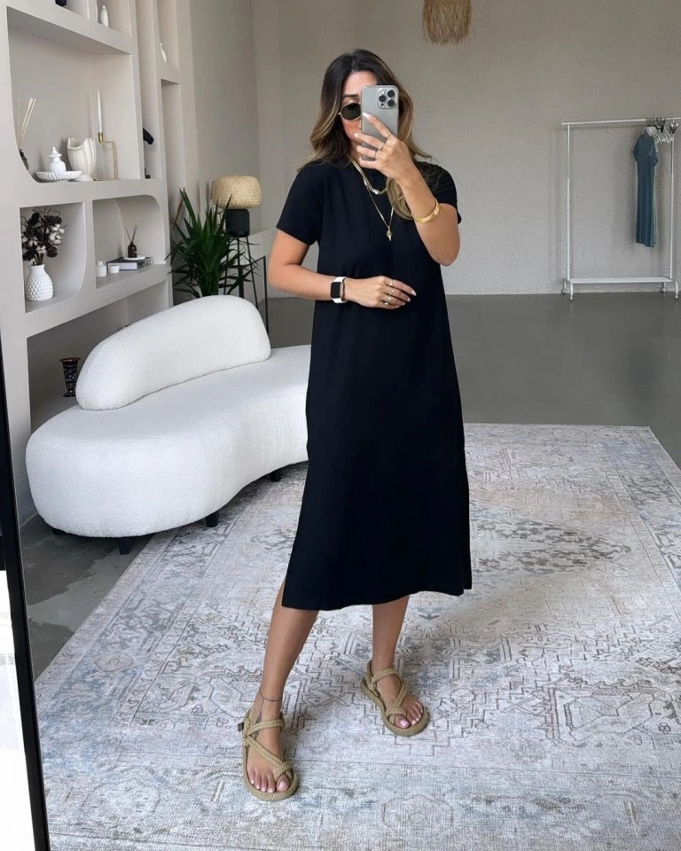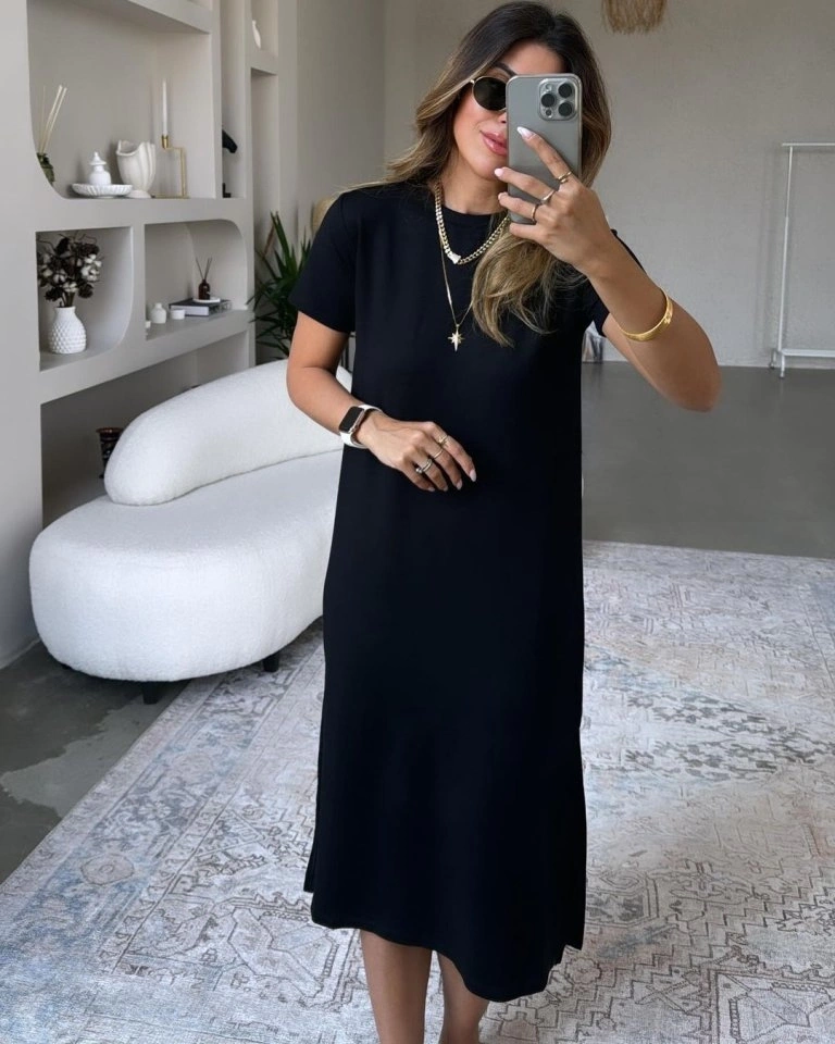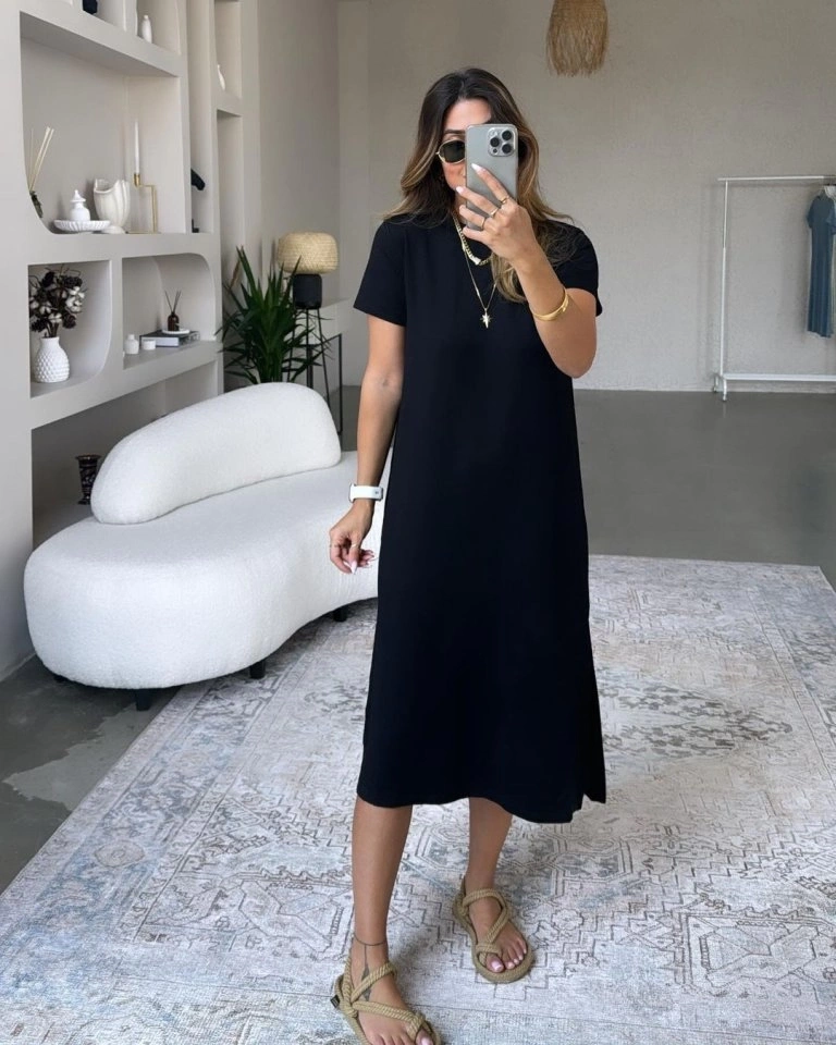 Kadın Kısa Kollu Yırtmaç Detaylı Salaş Viskon Elbise