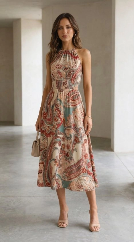 Kadın Kolsuz Boyundan Bağlamalı Beli Lastikli Dijital Baskı Süprem Uzun Elbise