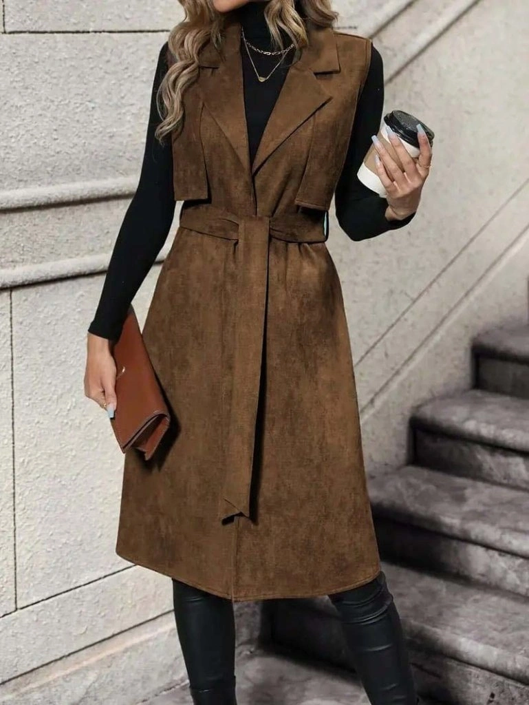 Kadın Kolsuz Yakalı önü Açık Belden Kuşaklı Süet Midi Yelek