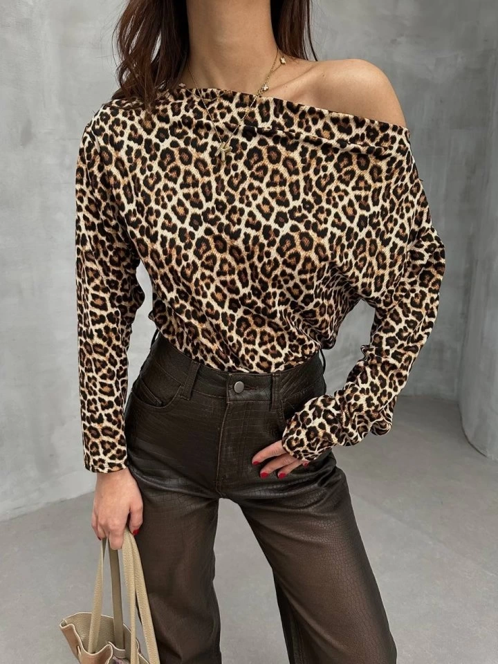 Kadın Leopar Desenli Düşük Omuzlu Bluz