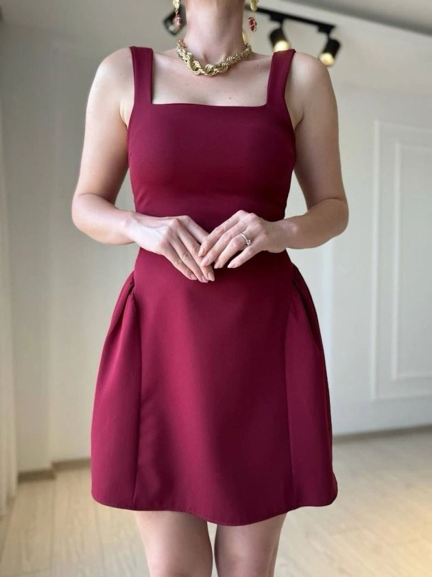 Kadın Omuz Askılı Kare Yaka Ithal Atlas Kumas Mini Elbise