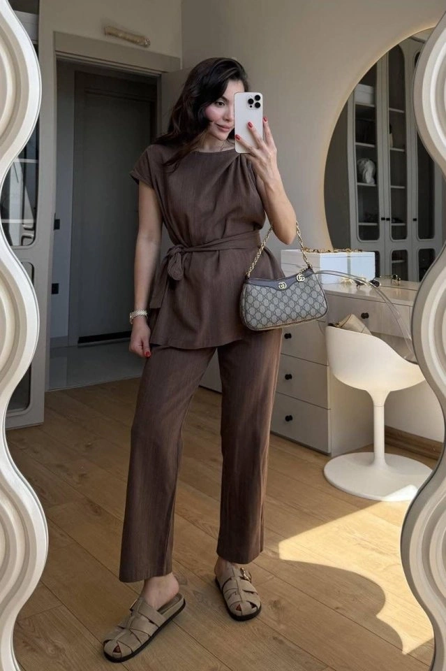Kadın Omuz Detay Kuşak Dahil Bluz Ve Pantolon Keten Kumaş Ikili Takım