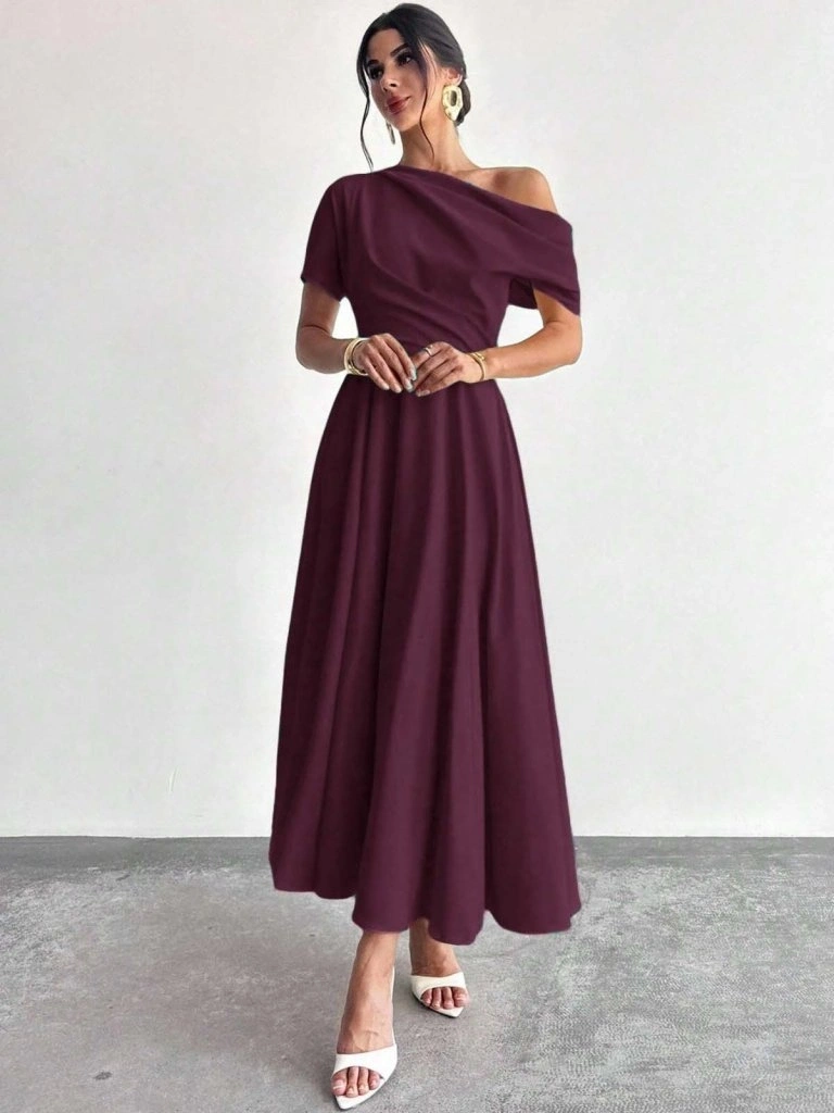 Kadın Omuzdan Açık Kısa Kollu Omuzdan Pileli Uzun Janjan Krep Elbise
