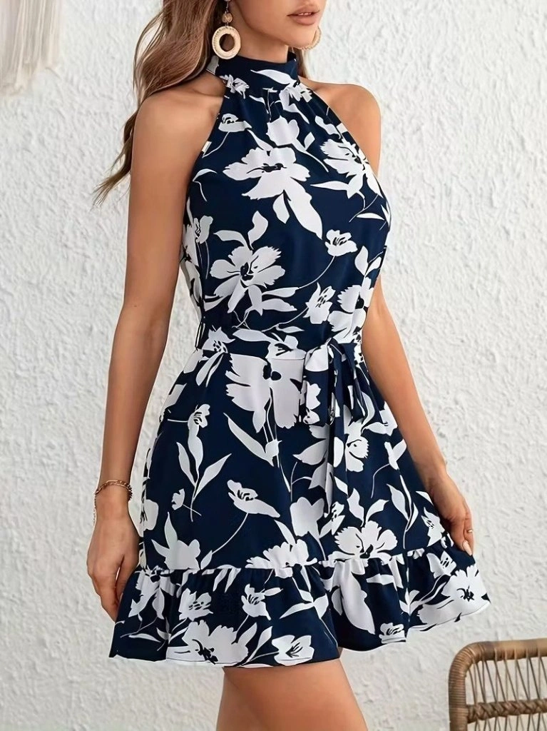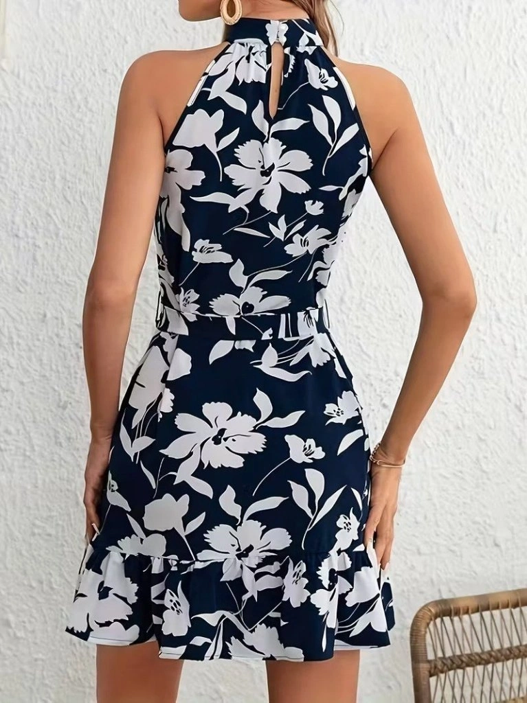 Kadın Omuzlardan Açık Balıkçı Yakalı Kuşaklı Desenli Kısa Süprem Elbise