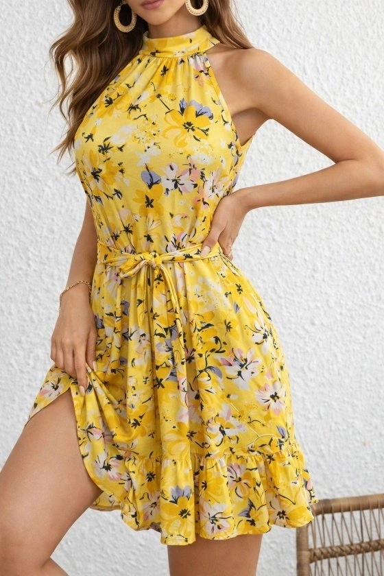 Kadın Omuzlardan Açık Balıkçı Yakalı Kuşaklı Desenli Kısa Süprem Elbise