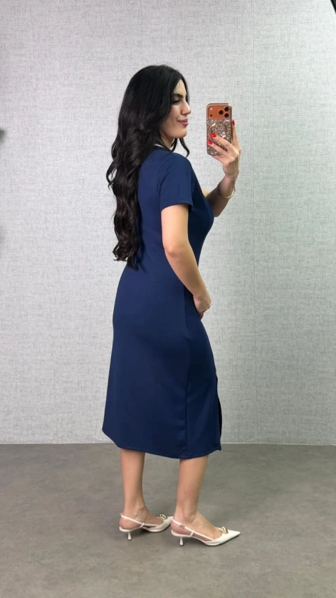 Kadın Polo Yaka çift Yırtmaç Detay Modal Kumaş Midi Boy Elbise