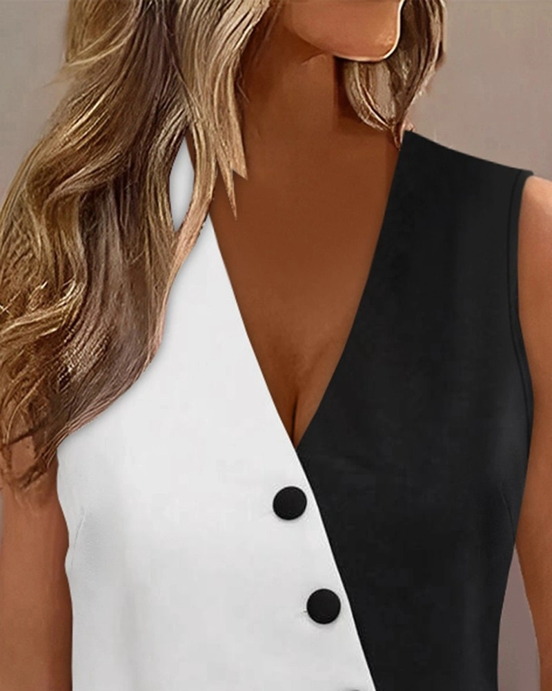 Kadın Sıfır Kol V Yakalı Düğmeli Blok Renkli Atlas Yelek