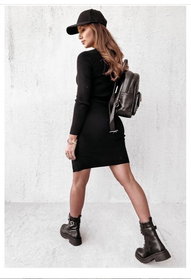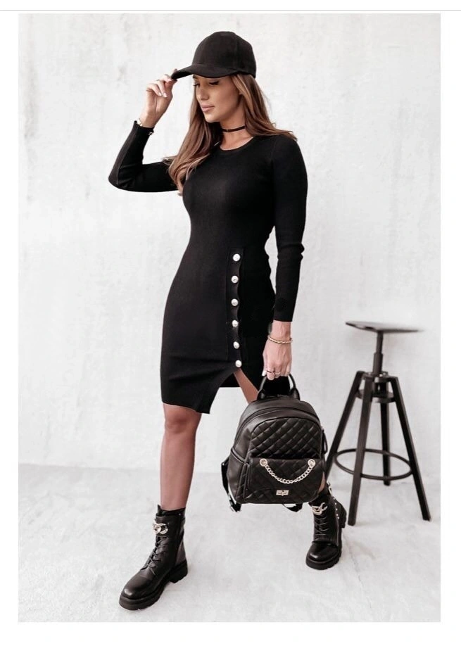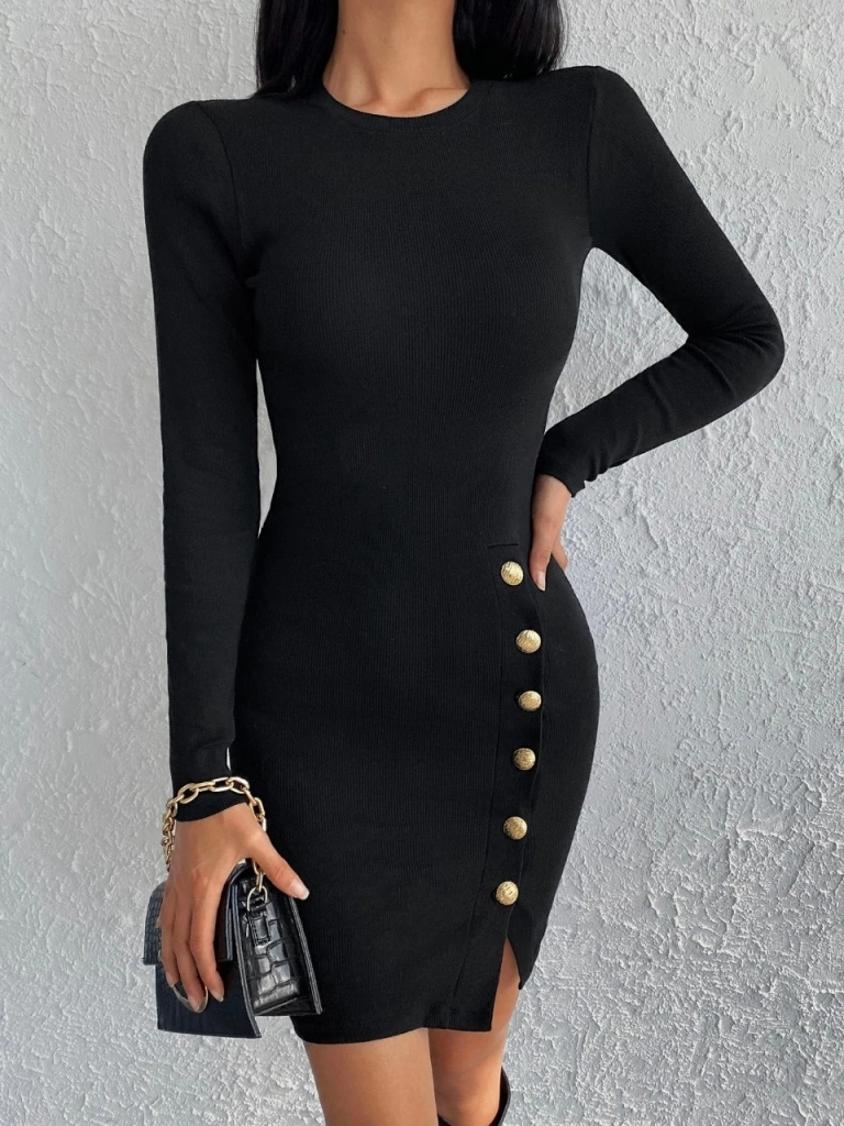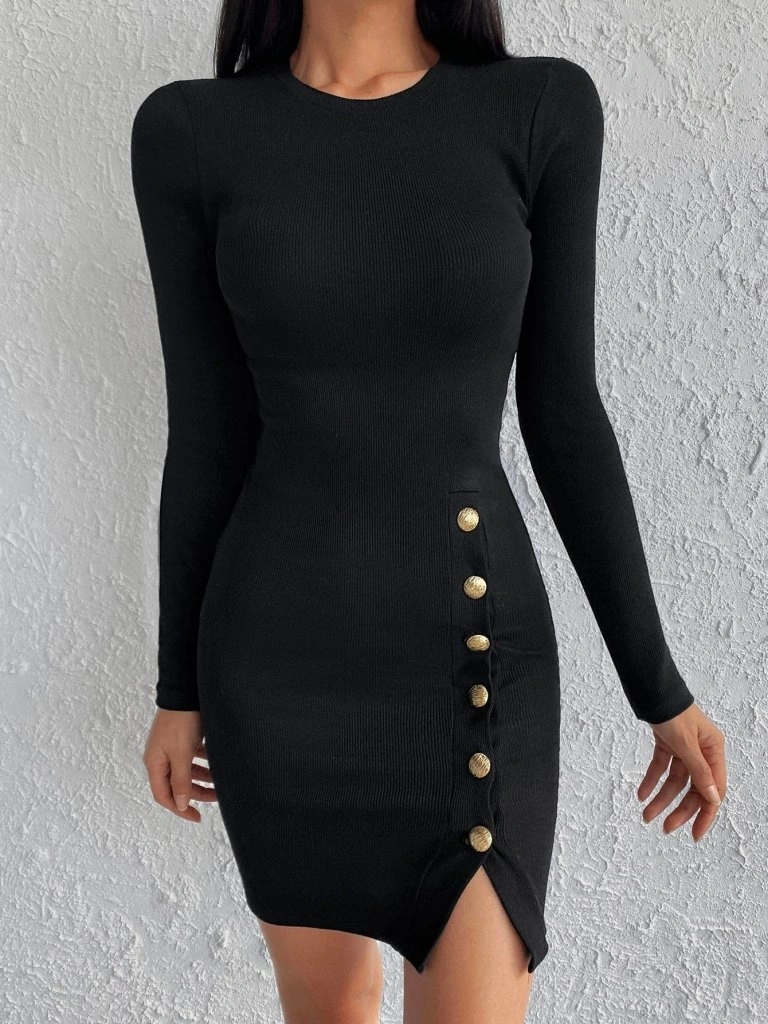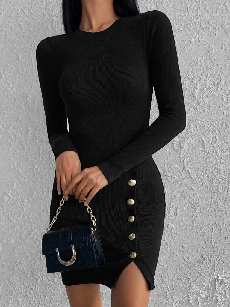 Kadın Siyah Uzun Kollu Bisiklet Yaka Yan Yırtmaç Düğme Detay Kısa Kaşkorse Elbise