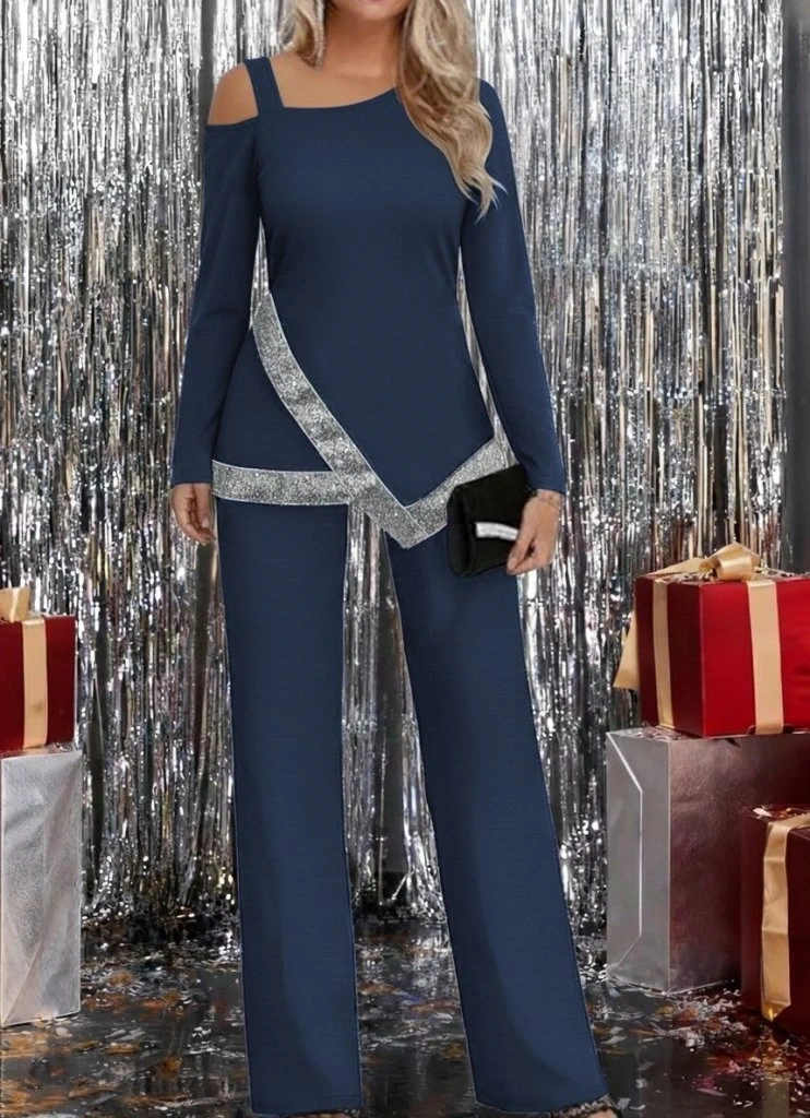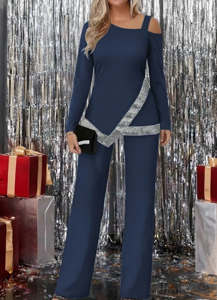 Kadın Tek Omuzdan Açık Uzun Kollu önü Pulpayet Ithal Krep Bluz Ve Pantolon