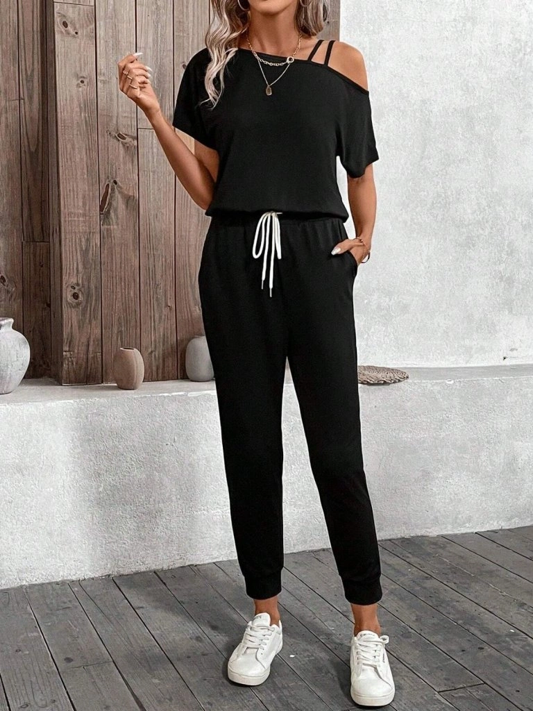Kadın Tek Omuzdan Açık Viskon Iki Iplik Bluz Bağcıklı Pantolon Ikili Takım