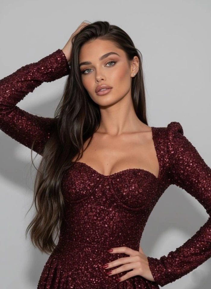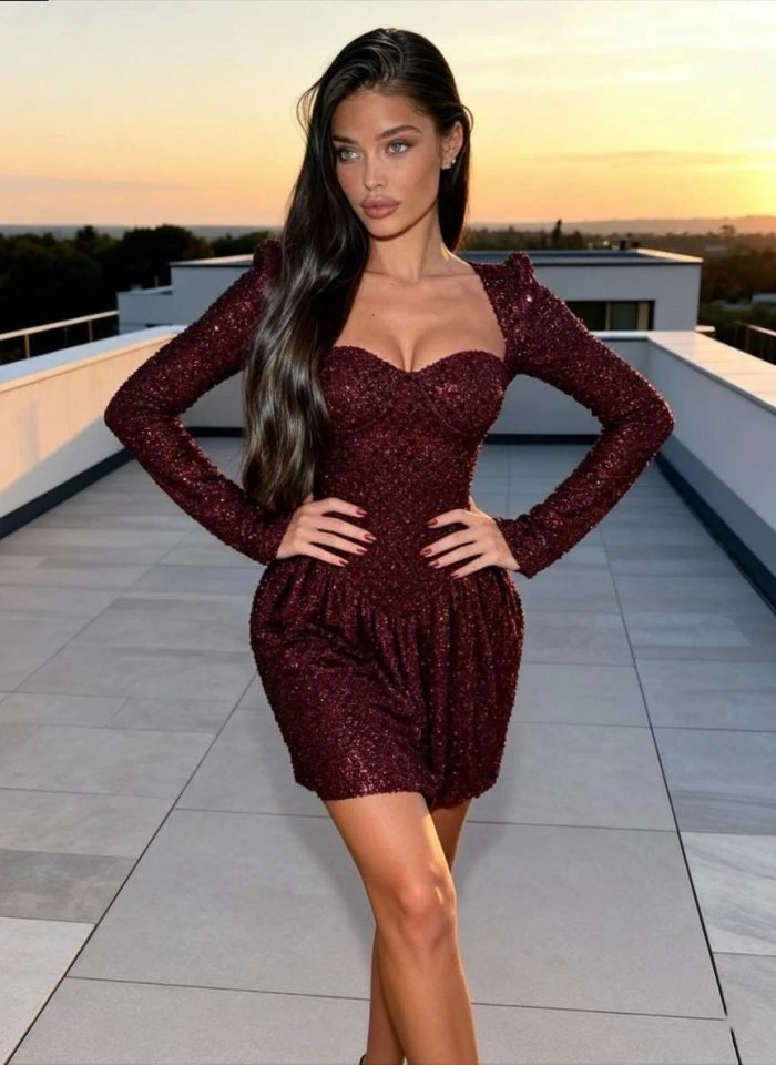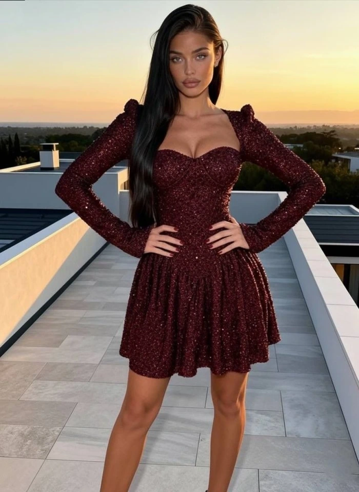 Kadın Uzun Kollu Armut Yaka Pul Payet Işlemeli Mini Gece Elbisesi