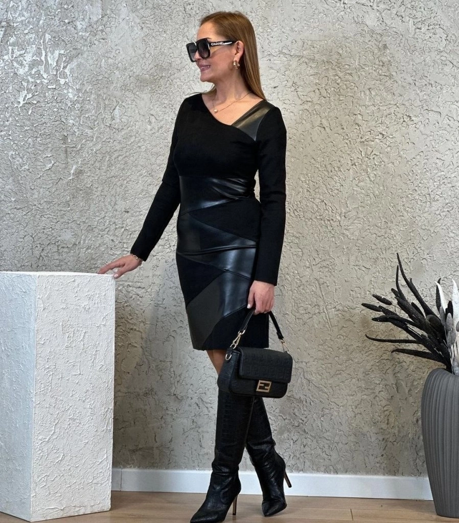 Kadın Uzun Kollu Asimetrik Yaka Süet Ve Deri Mini Boy Elbise