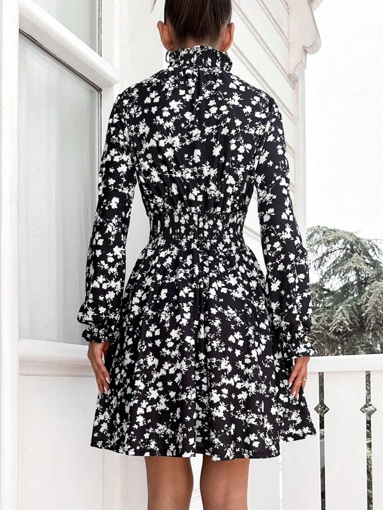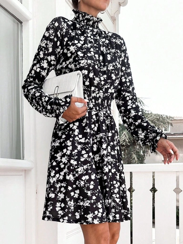 Kadın Uzun Kollu Balıkçı Yaka çiçek Baskılı Helen Kumaş Elbise