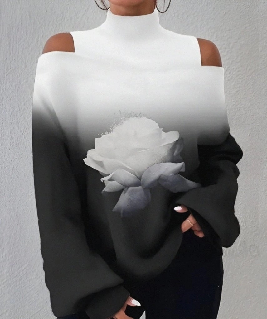 Kadın Uzun Kollu Balıkçı Yaka Omuz Pencereli Gül Dijital Baskılı şardonlu Dalgıç Salaş Bluz