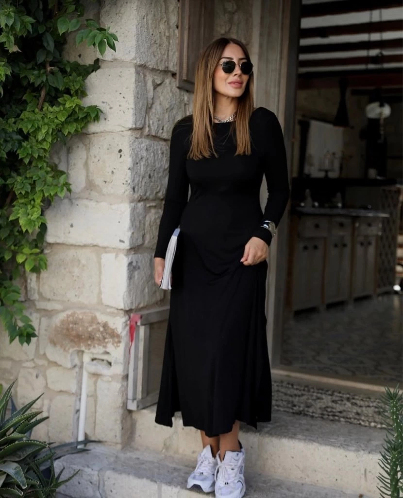 Kadın Uzun Kollu Bisiklet Yaka Arkası çapraz Detaylı Viskon Iki Iplik Maxi Elbise