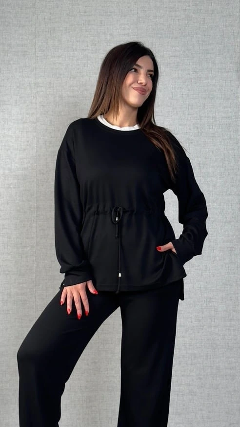 Kadın Uzun Kollu Bisiklet Yaka Belden Büzgülü Bağcıklı Viskon Iki Iplik Bluz Ve Pantolon Ikili Takım