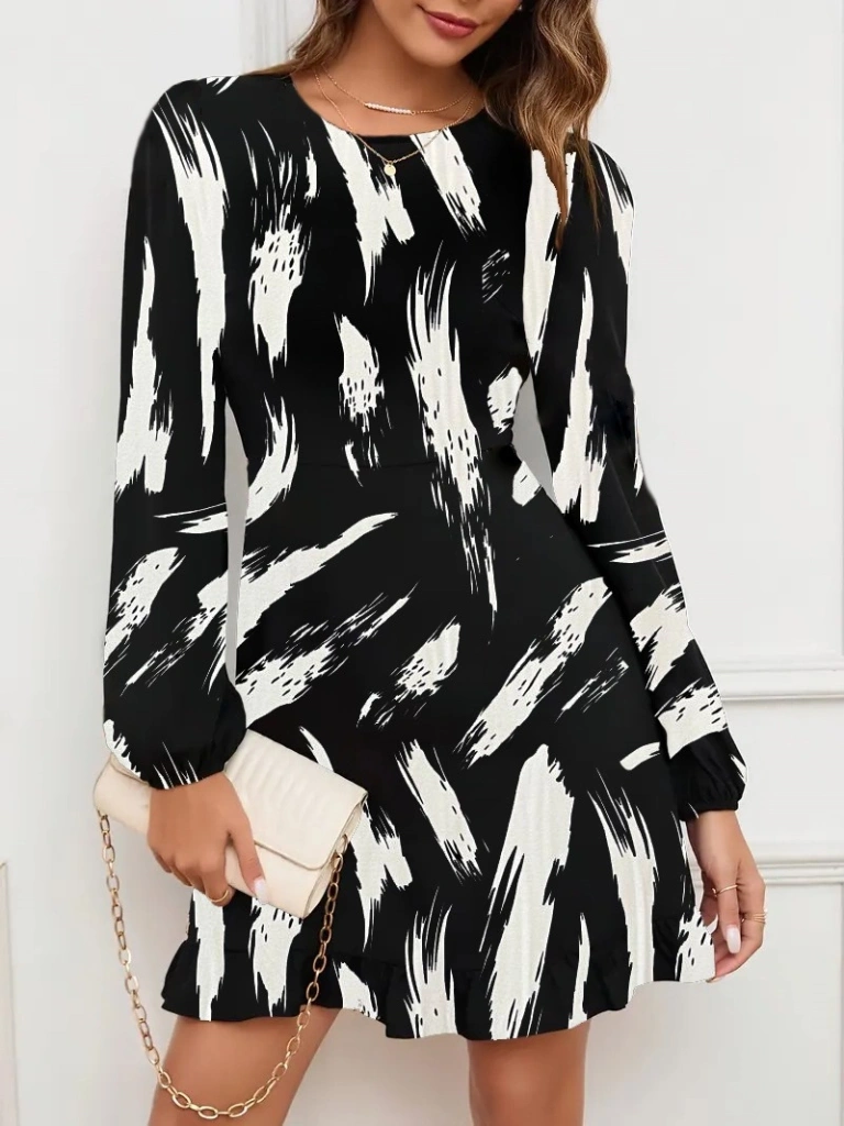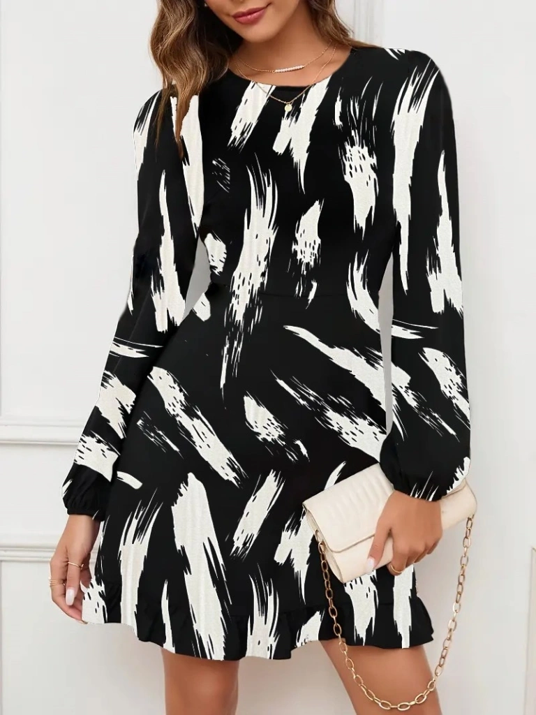Kadın Uzun Kollu Bisiklet Yaka Desenli Kısa Krep Elbise