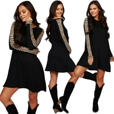 Kadın Uzun Kollu Bisiklet Yaka Kollar Leopar şeritli Salaş Iki Iplik Elbise