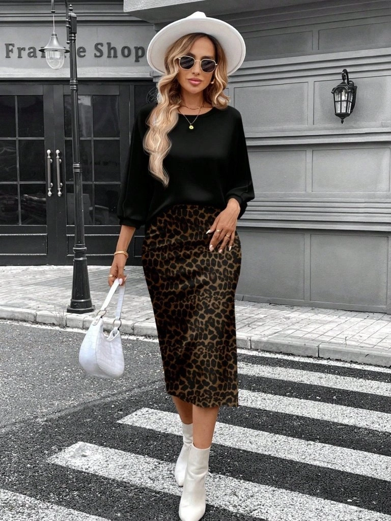Kadın Uzun Kollu Bisiklet Yaka Modal Bluz Ve Leopar Desenli Etek Ikili Takım
