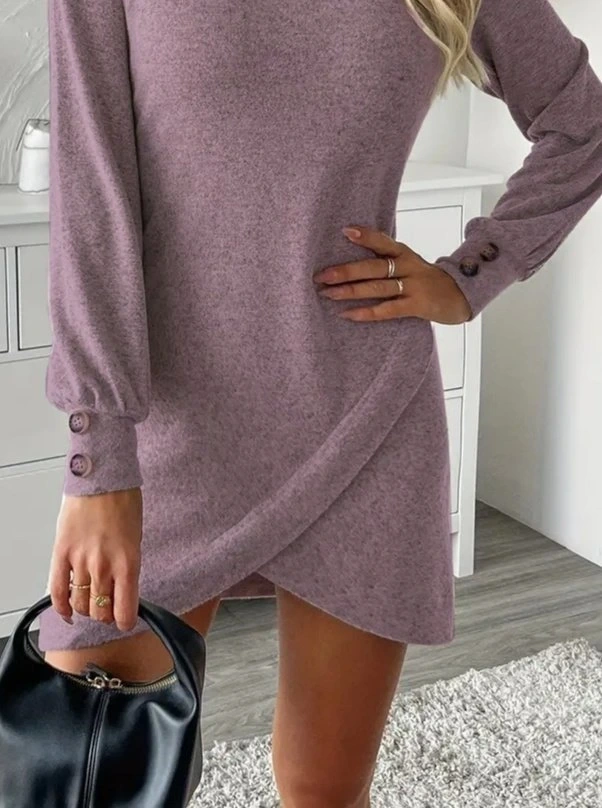 Kadın Uzun Kollu Bisiklet Yaka önden Asimetrik Kesim Detaylı Mini Yumoş Elbise