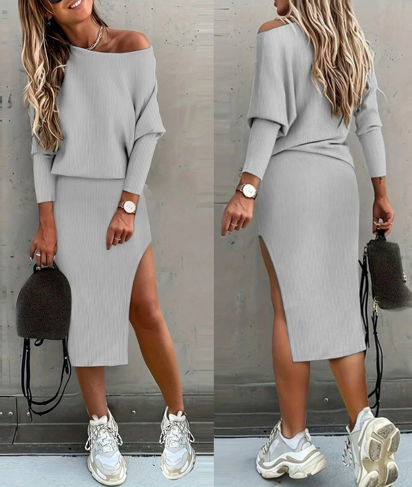 Kadın Uzun Kollu Düşük Omuz Yırtmaç Detay Kaşkorse Etek Bluz Ikili Takım