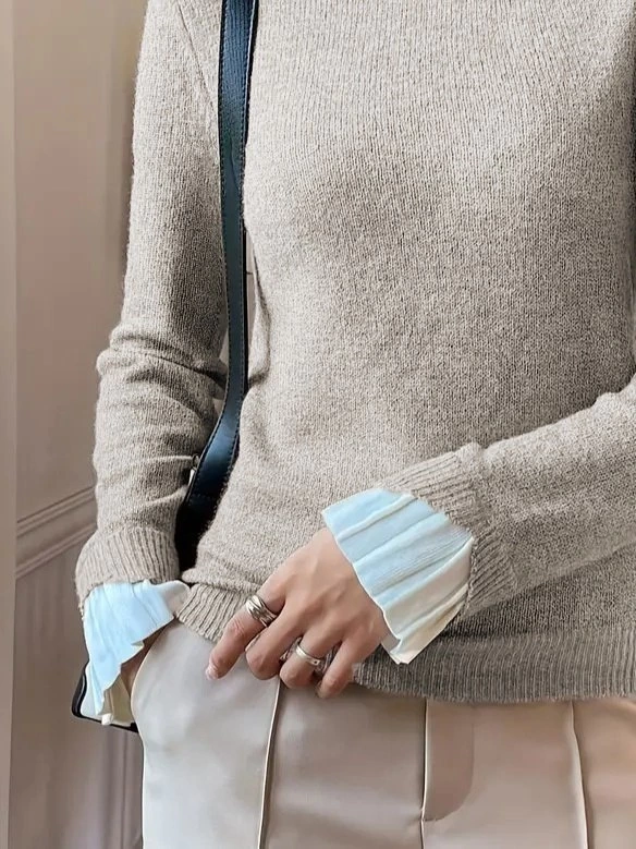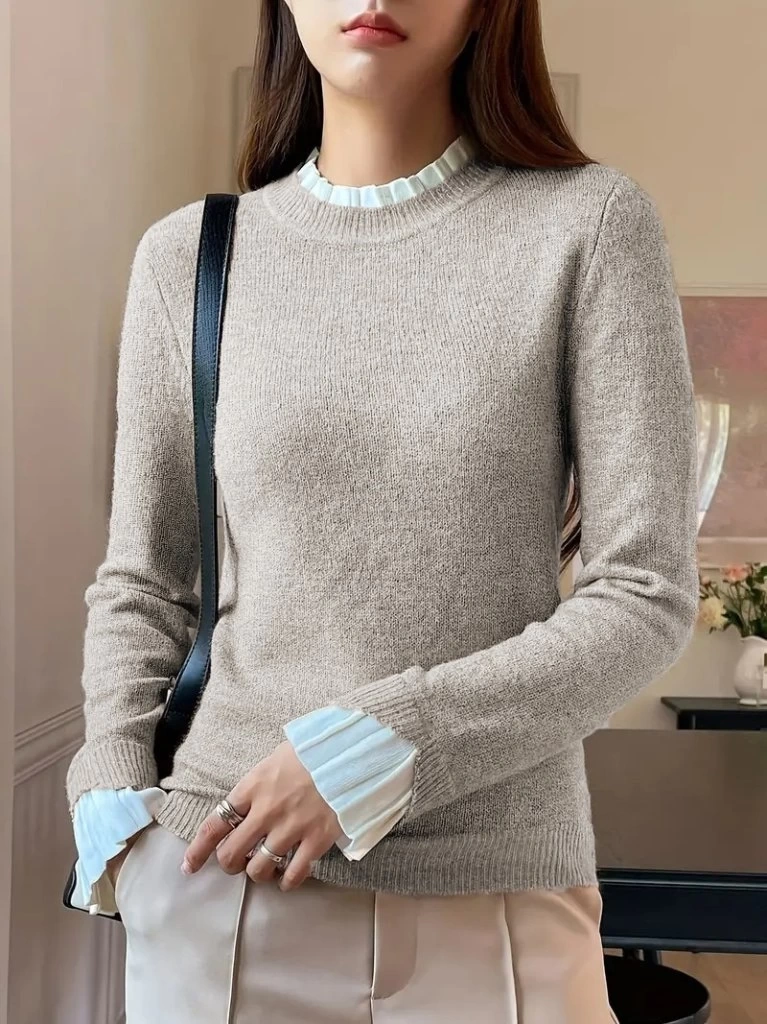 Kadın Uzun Kollu Fırfırlı Yakalı Triko Krem Bluz
