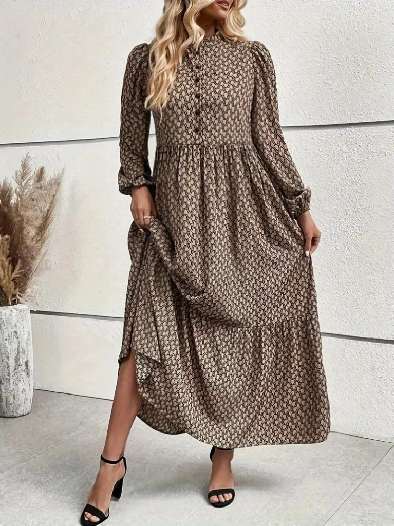 Kadın Uzun Kollu Hakim Yakalı Düğmeli Kemersiz Desenli Maxi Süprem Elbise