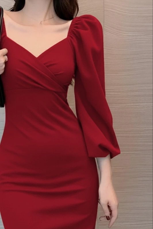 Kadın Uzun Kollu Kalp Yakalı Midi Ithal Krep Elbise