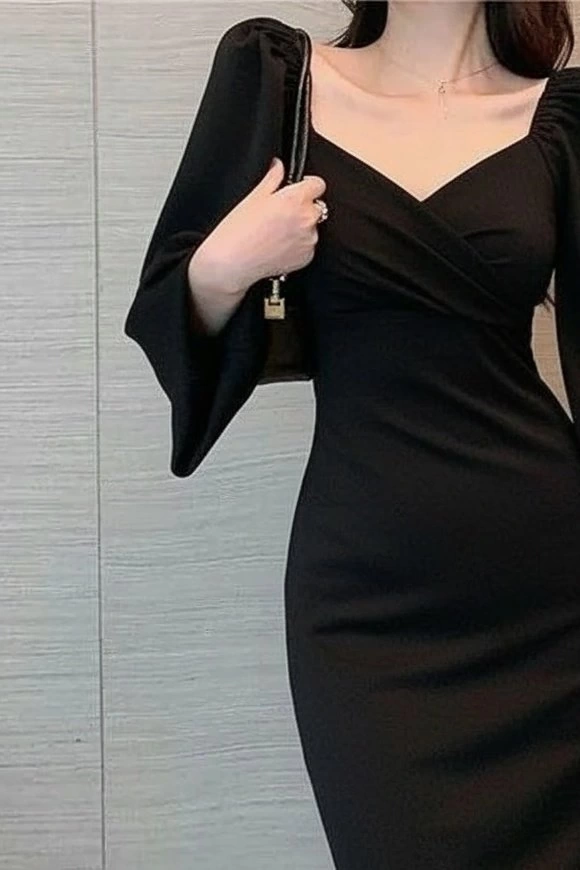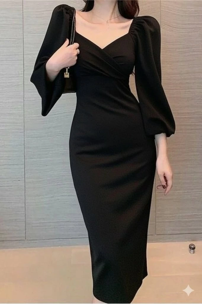 Kadın Uzun Kollu Kalp Yakalı Midi Ithal Krep Elbise