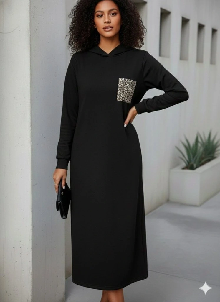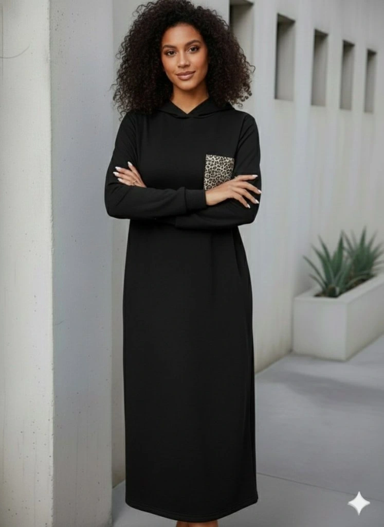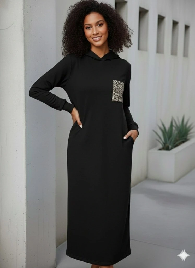 Kadın Uzun Kollu Kapşonlu Cep Detaylı Viskon Iki Iplik Maxi Elbise