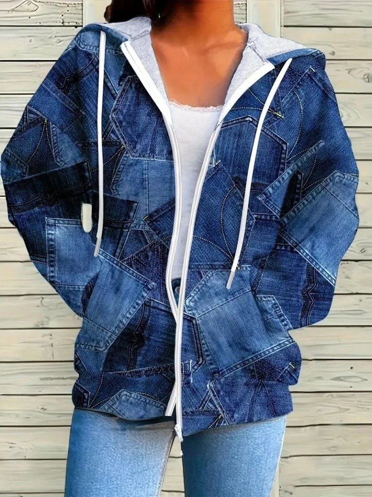 Kadın Uzun Kollu Kapşonlu Fermuarlı Kot Desenli Bağcıklı Modal Ceket