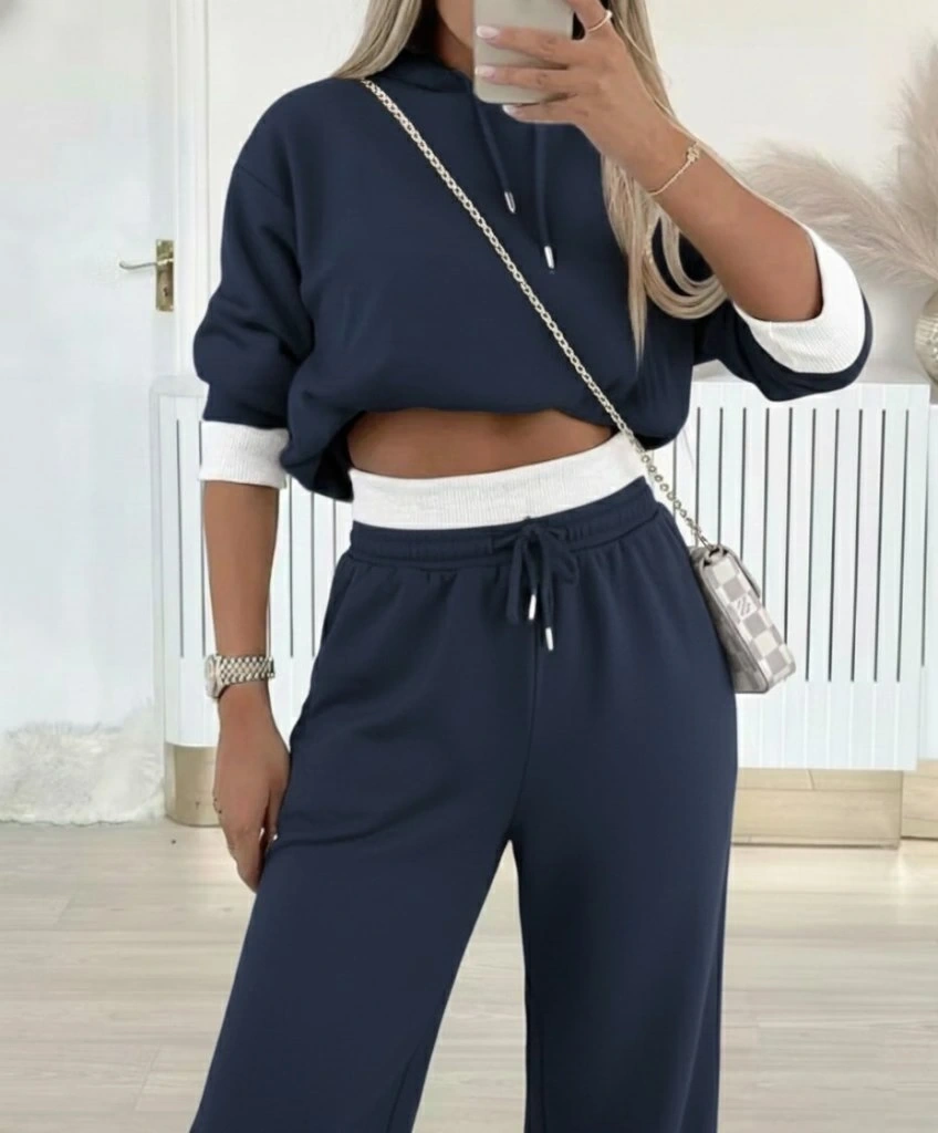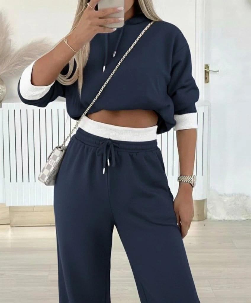 Kadın Uzun Kollu Kapşonlu Viskon Iki Iplik Füme Bluz Ve Pantolon Ikili Takım
